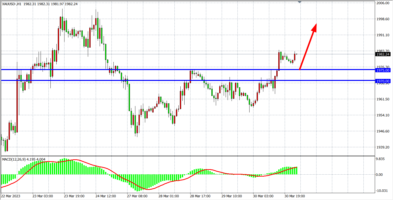 1小时图看,现货黄金进一步走高接连突破1970-1975的压力,趋势转为上升,MACD于零轴之上均匀放量,当前支撑关注1970-1975区域,日内继续看涨,目标2000-更高。