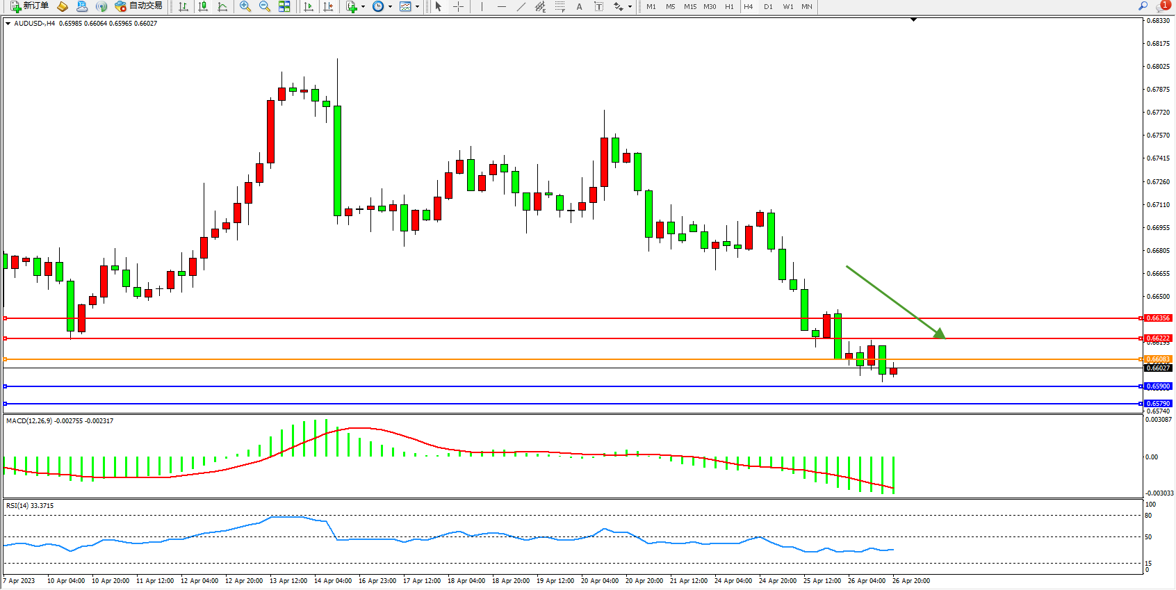 交易策略:0.66083下方看跌,目标0.65900  0.65790