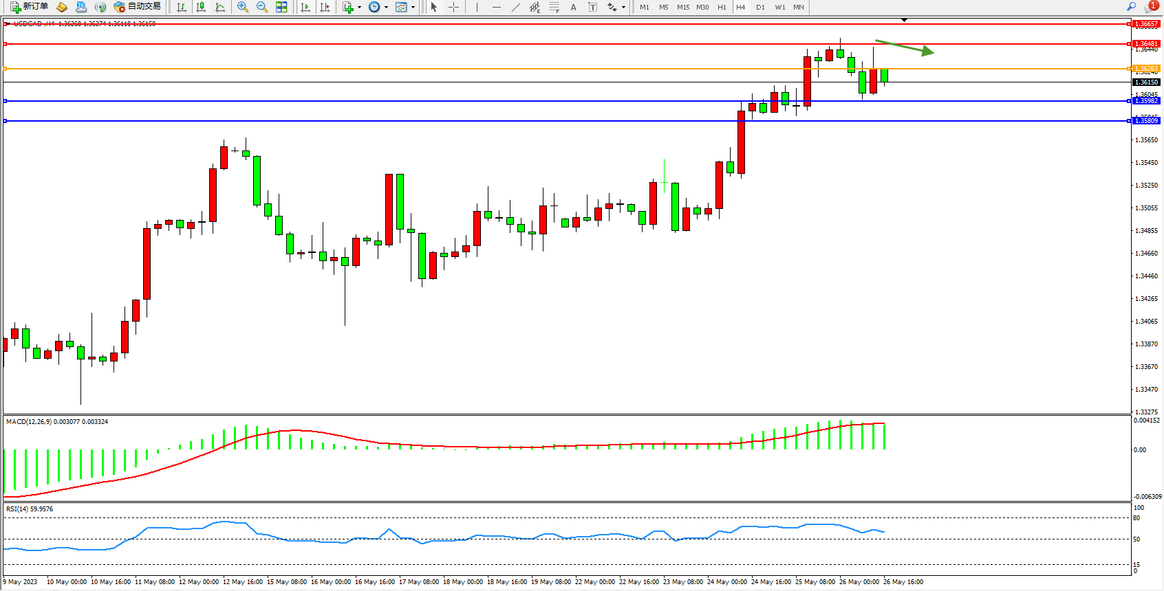 美元加元USDCAD——4小时K线图显示: