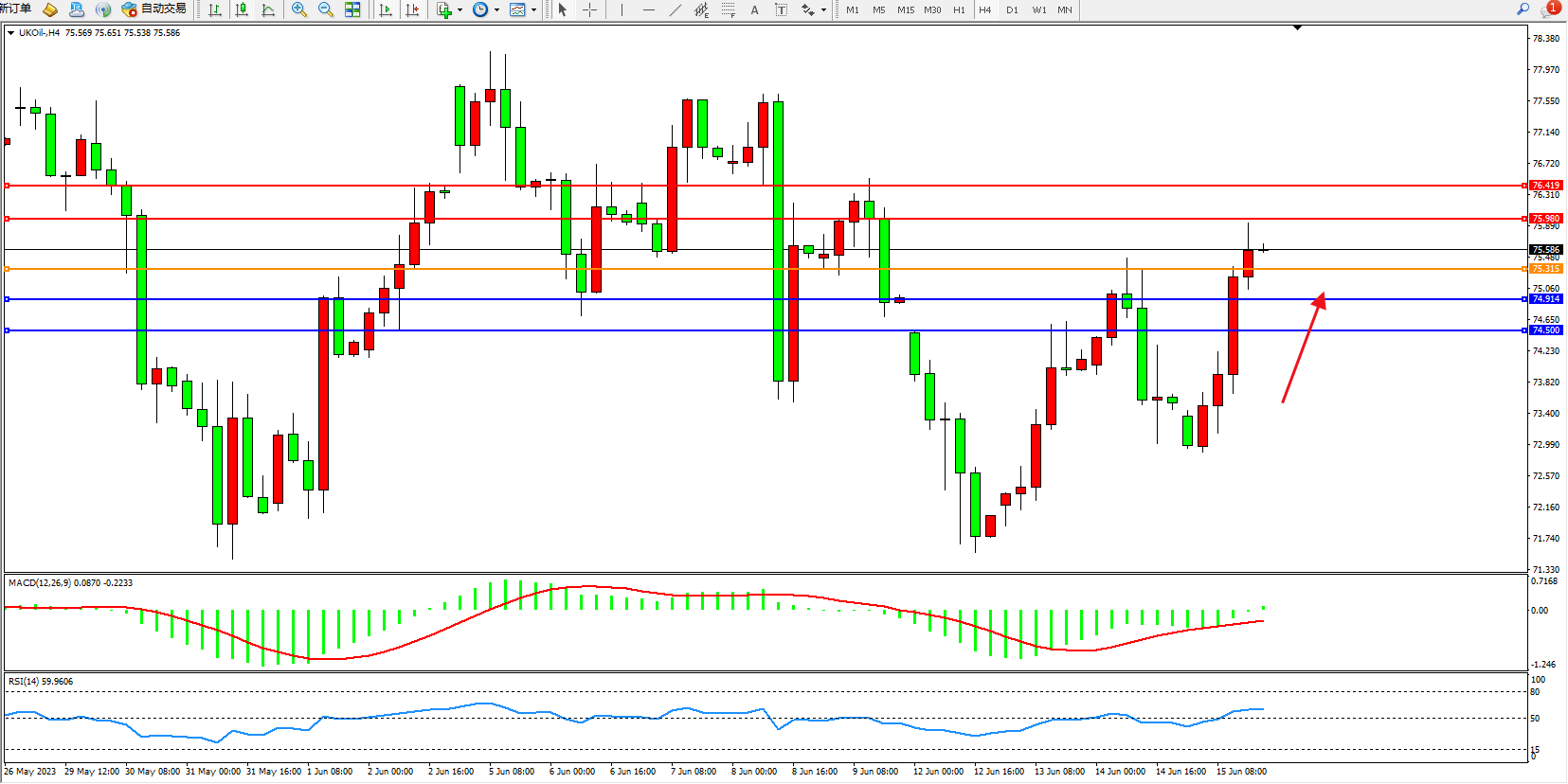交易策略:75.315上方看涨,目标75.860 76.419