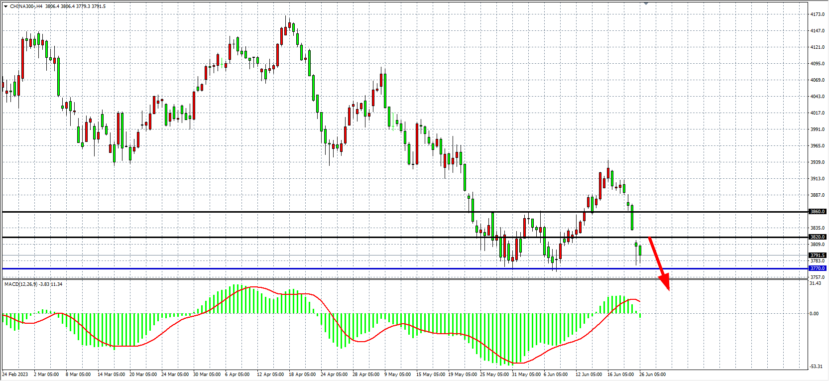 4小时图看,沪深300在进一步跌破3800,MACD量能开始下穿零轴,趋势进一步走弱,下方支撑关注3770,上方压力3820-3860。