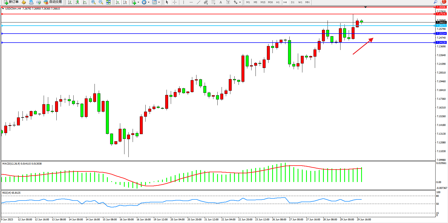 美元人民币USDCNH——4小时K线图显示: