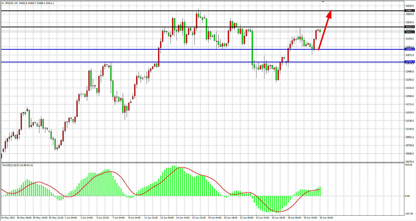 4小时图看,日经指数在33000之上继续走高,MACD量能于零轴之上,趋势延续反弹,阻力关注33500-33900,支撑关注32800、32300。