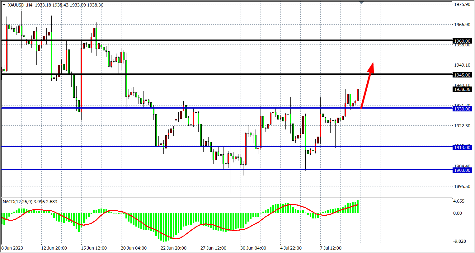 4小时图看,黄金延续走高突破1930美元,MACD量能在零轴上运行,行情上行趋势明显,支撑关注1930-1920,阻力关注1945-1960。