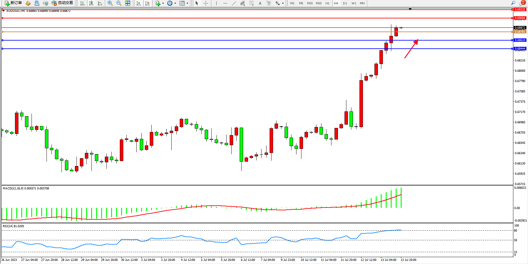 交易策略:0.68781上方看涨,目标0.69056  0.69225