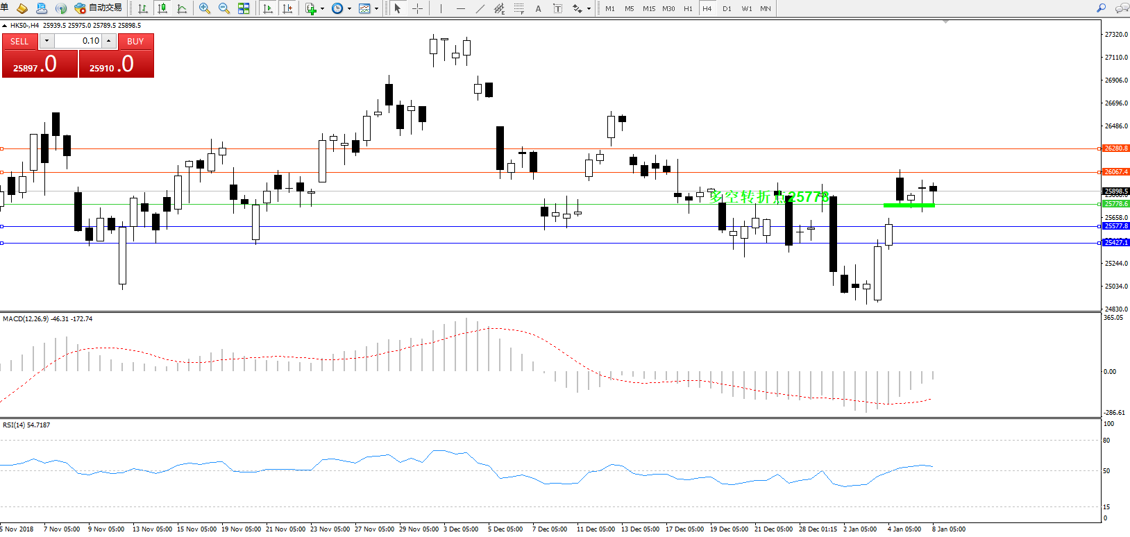 恒指HK50 ——4小时K线图显示: