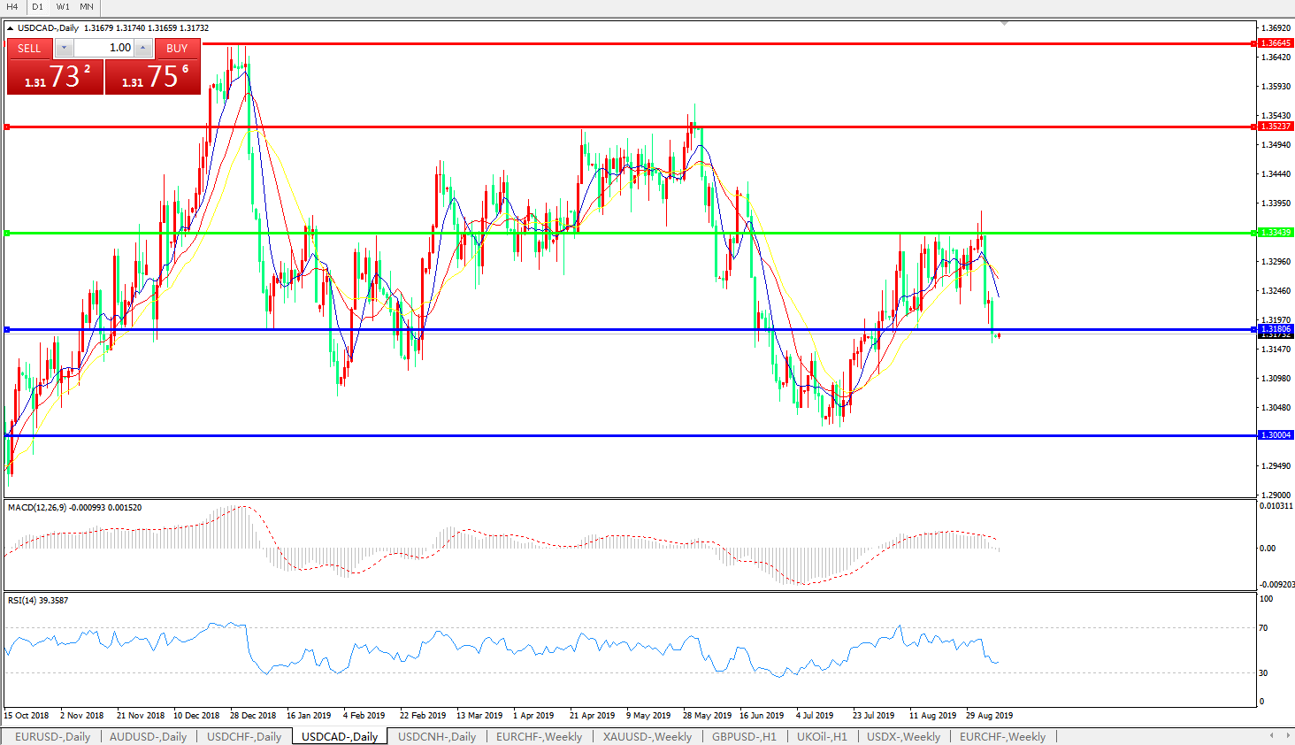技术面简析:日线图均线呈下行态势,汇价延续下跌模式,MACD于0轴上方拐头下行且量能0轴下方显现,RSI逐步走低,汇价开启下行模式,预计短期汇价有进一步下行空间。