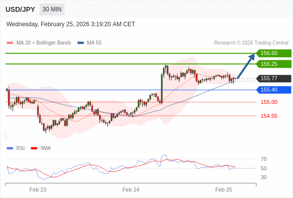 在 155.40 之上,看涨,目标价位为 156.25 ,然后为 156.60 。