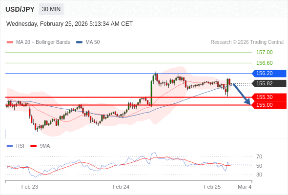 交易策略: 在 156.20 之下,看跌,目标价位为 155.30 ,然后为 155.00 。