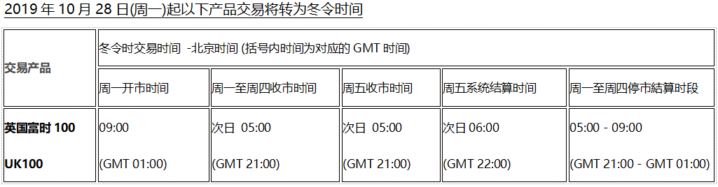 欧洲时区将于2019年10月28日(周一)及北美时区将于2019年11月4日(周一)开始分别转为冬令时交易时间, 各欧美市场产品的交易时间将随调整为冬令时交易时间,敬请留意!