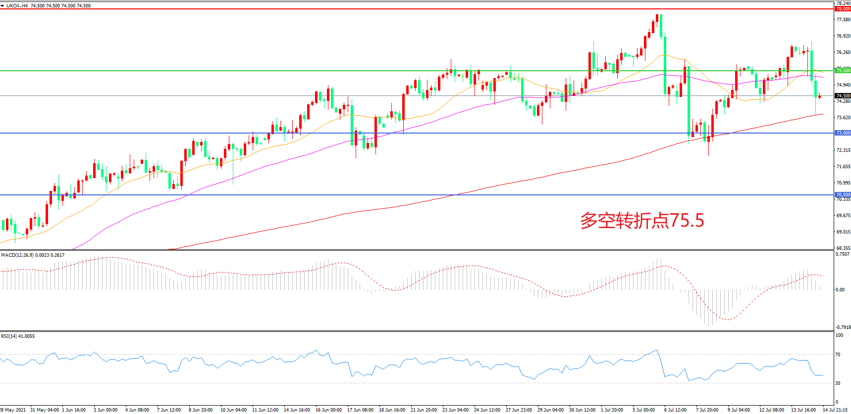 交易策略:在75.50之下看跌,目标73.00                70.50