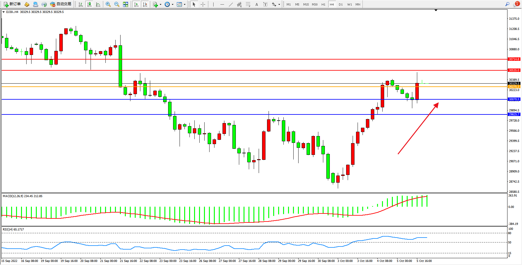 道琼斯指数10月5日(周三)收盘下跌42.45点,跌幅0.14%,报30273.87点;美国9月ADP就业人数 20.8万人,预期20万人,前值13.2万人。ADP就业数据略好于预期,数据公布后美联储11月加息75个基点的概率略有上升。
