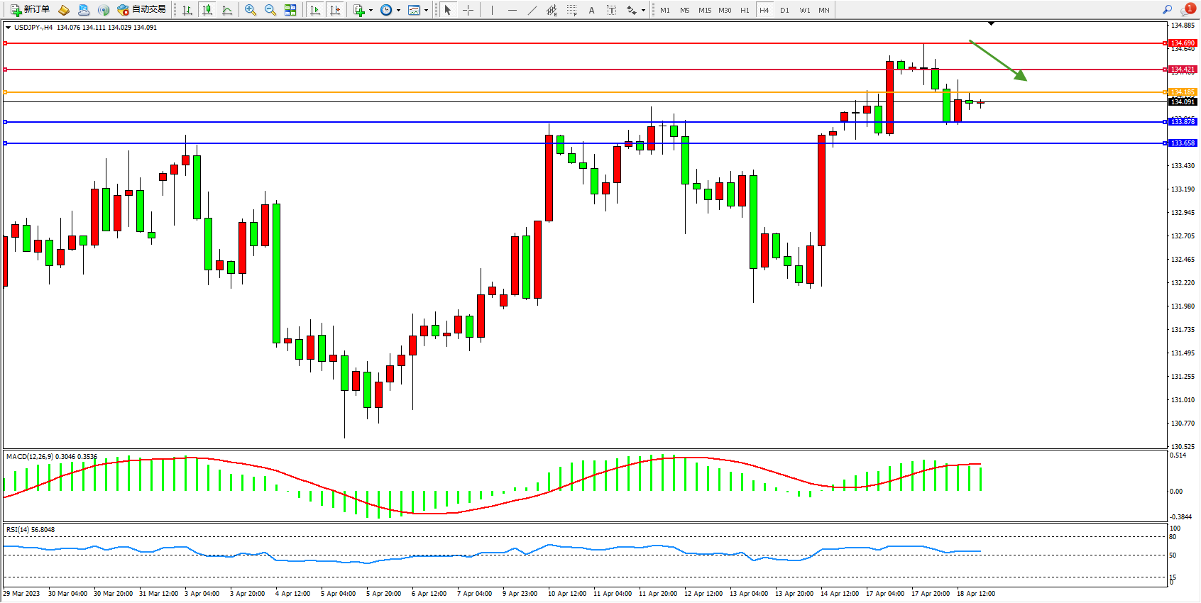 交易策略:134.185下方看跌,目标133.878  133.658