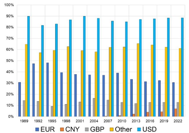 国际清算银行每三年进行一次的外汇市场调查证实,尽管美元的市场份额略有下降,但在竞争中仍遥遥领先。