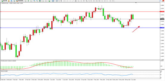 多头动力维持震荡上行,短期看涨情绪持续,短期有继续向上拉升态势上方压制关注1.25741附近,低位支撑关注1.23078附近,,MACD指标处于0轴线下侧弱势整理,RSIZ指标处于50均衡线附近震荡;如图: