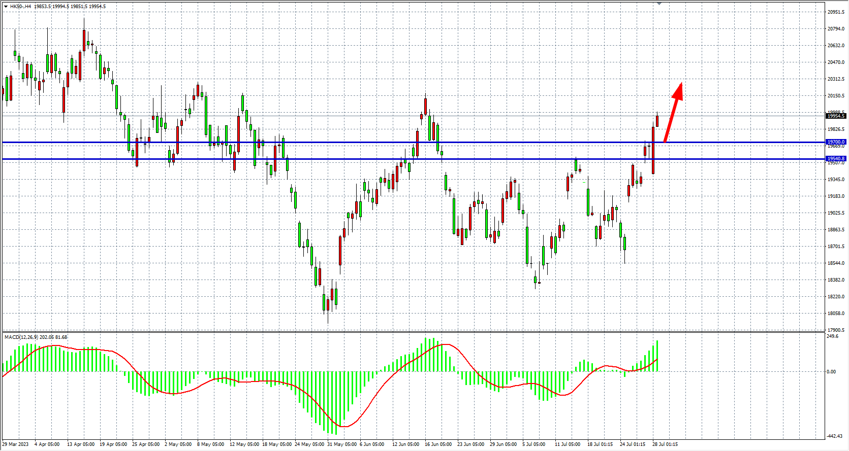 4小时图看,恒指一度上行挑战20000关口,MACD量能在零轴上继续放大,支撑上移19540-19700,上方目标看20000-20300附近。